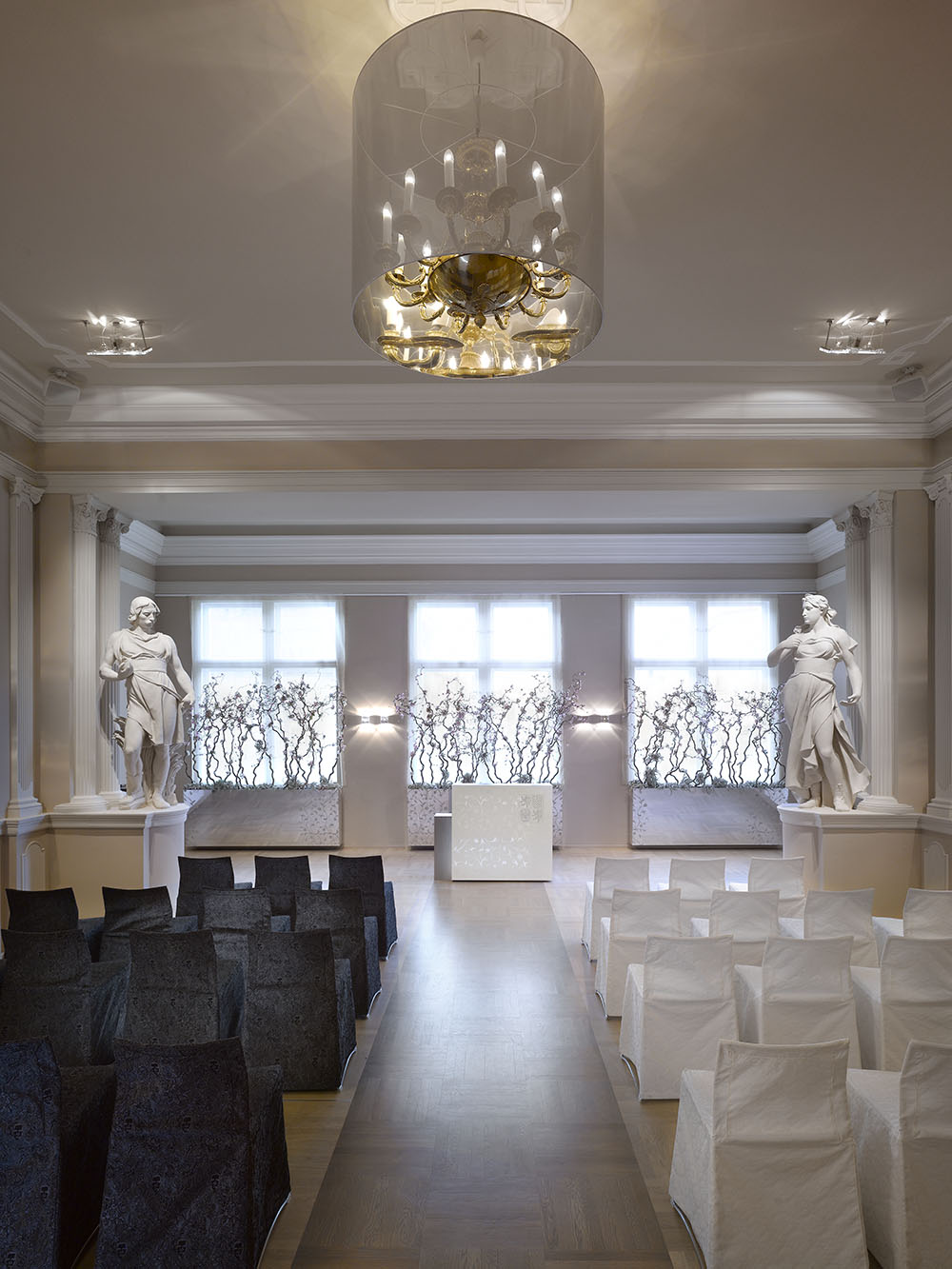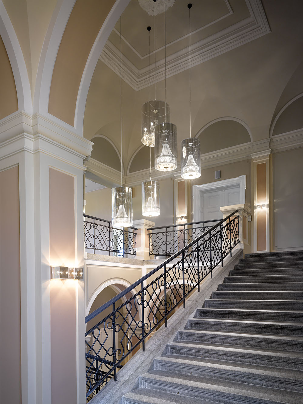 The main inspirational source of the city hall interiors was the reconstructed neo-renaissance building with an extensive stucco decoration. Our attempt to achieve a symbiosis of the past and presence led us to use visual means of contemporary design with historical quotations; at the same time, it influenced the color of paint, the choice of materials and lamps and the entire concept of lighting as well as the use of ornamental decorations which became the key motif of the whole interior, including the graphic design of orientational system of the building.